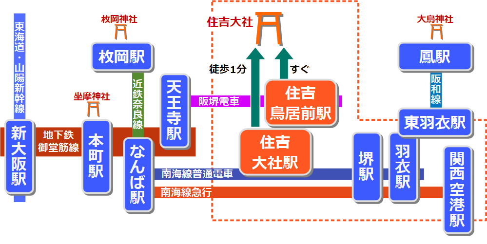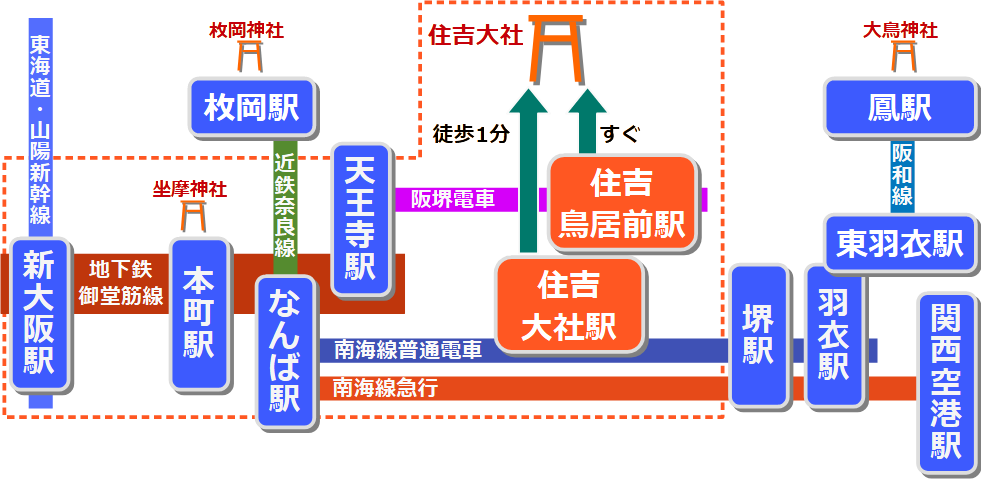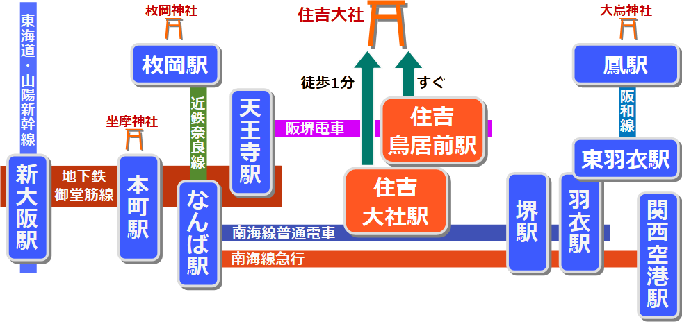 住吉大社へは、次のいずれかで行けます。
