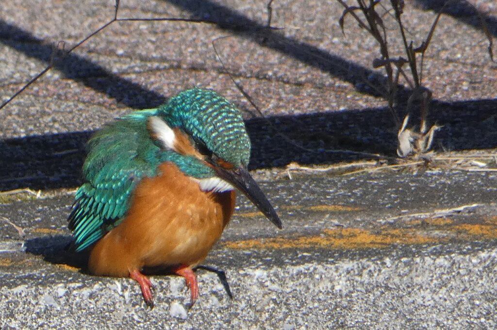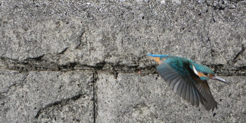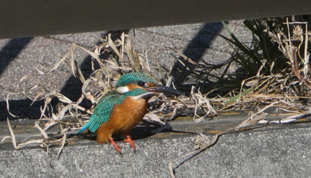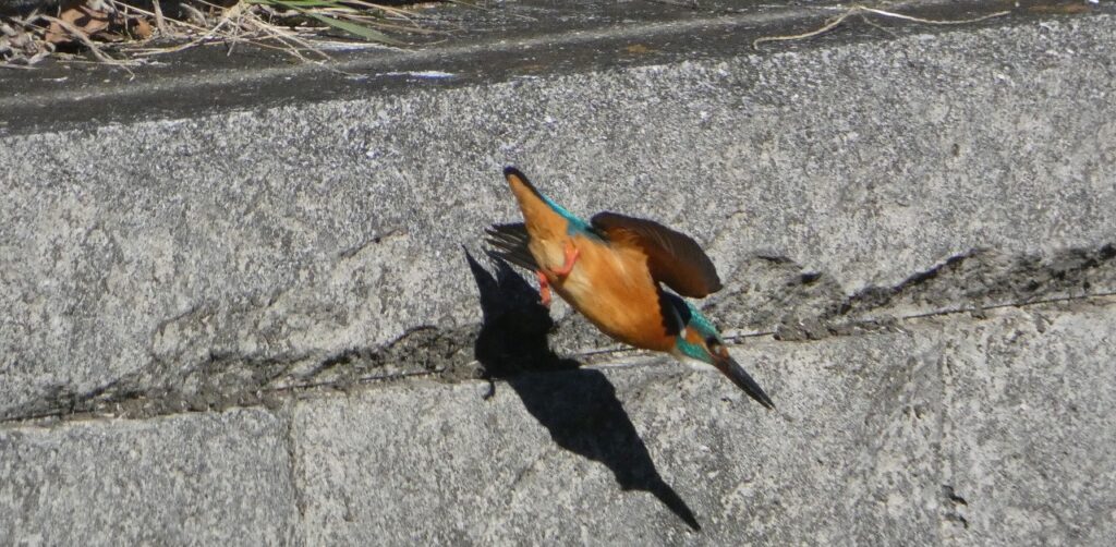 愛宕橋手前で、護岸の上から流れのなかを観察するカワセミさん。