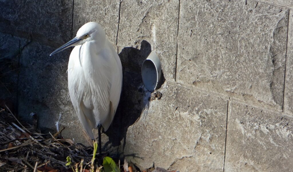 壁を背にぽつんとひとりコサギさん。